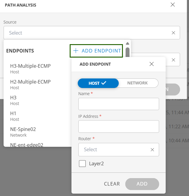 In network path analysis, an endpoint is a node in the analyzed network path that serves as the starting or ending point of traffic flow. It represents a network device, such as a router, switch, or server, that initiates or terminates communication.Before you can perform a path analysis, you need to add the source and destination endpoints.
